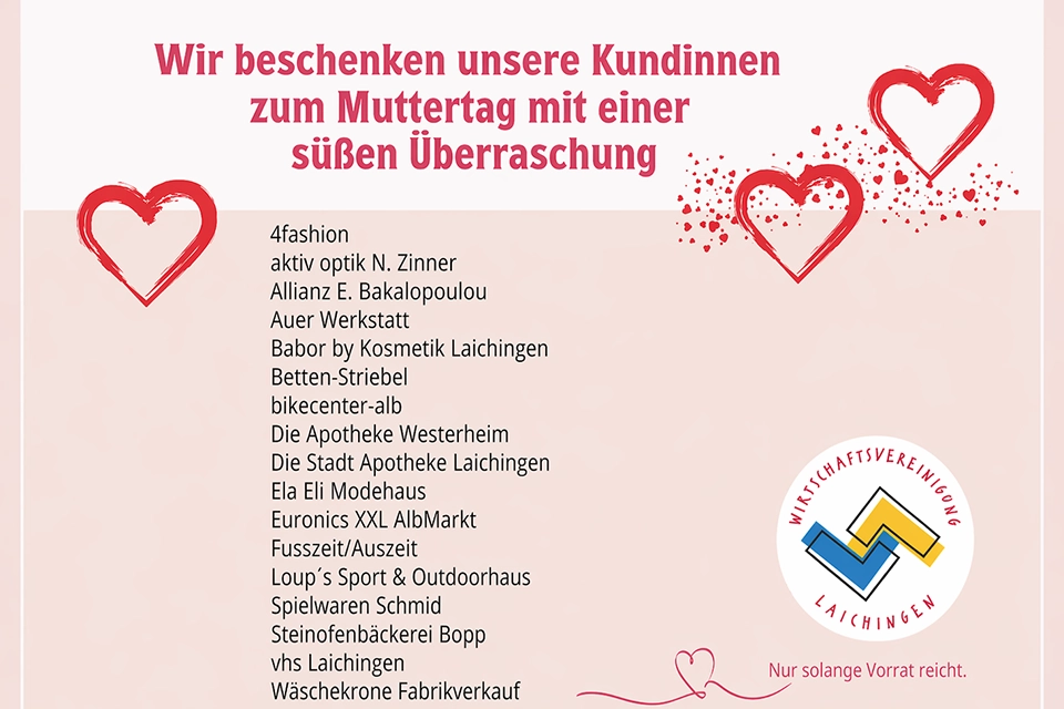 Alle teilnehmenden Betriebe verschenken in der Muttertagswoche schön verzierte Keks-Herzen an alle Frauen! Ob Großmutter, Mutter, Tante oder einfach nur Frau – an diesem Tag feiern wir Euch alle! Dies ist eine wunderschöne Gelegenheit einfach mal „DANKE“ zu sagen an alle wunderbaren Frauen.